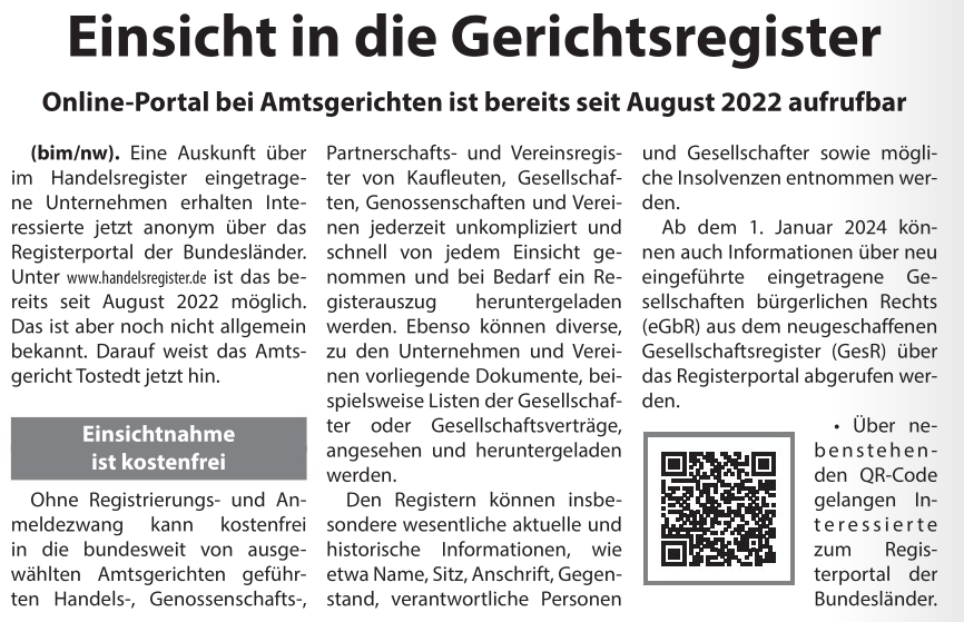 Anonyme Einsicht in die öffentlichen Register der Amtsgerichte
