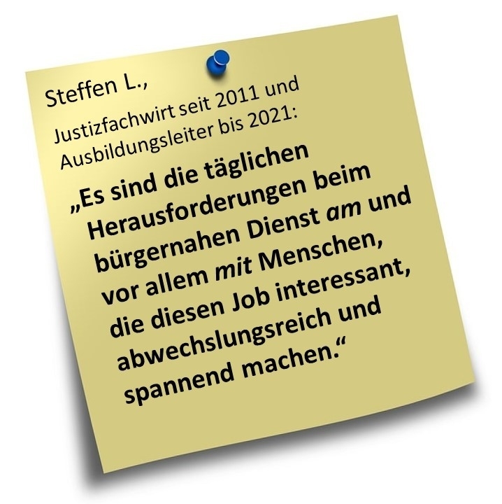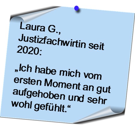 Justizfachwirte sind das Bindeglied zwischen Bürger und Justiz. Sie arbeiten in einem kompetenten Team für und mit Menschen. Der Beruf bietet verantwortungsvolle Aufgaben, Aufstiegsmöglichkeiten und einen Einklang von Beruf und Familie bei attraktiver Vergütung - bereits während der Ausbildung - und einen krisensicheren Arbeitsplatz.