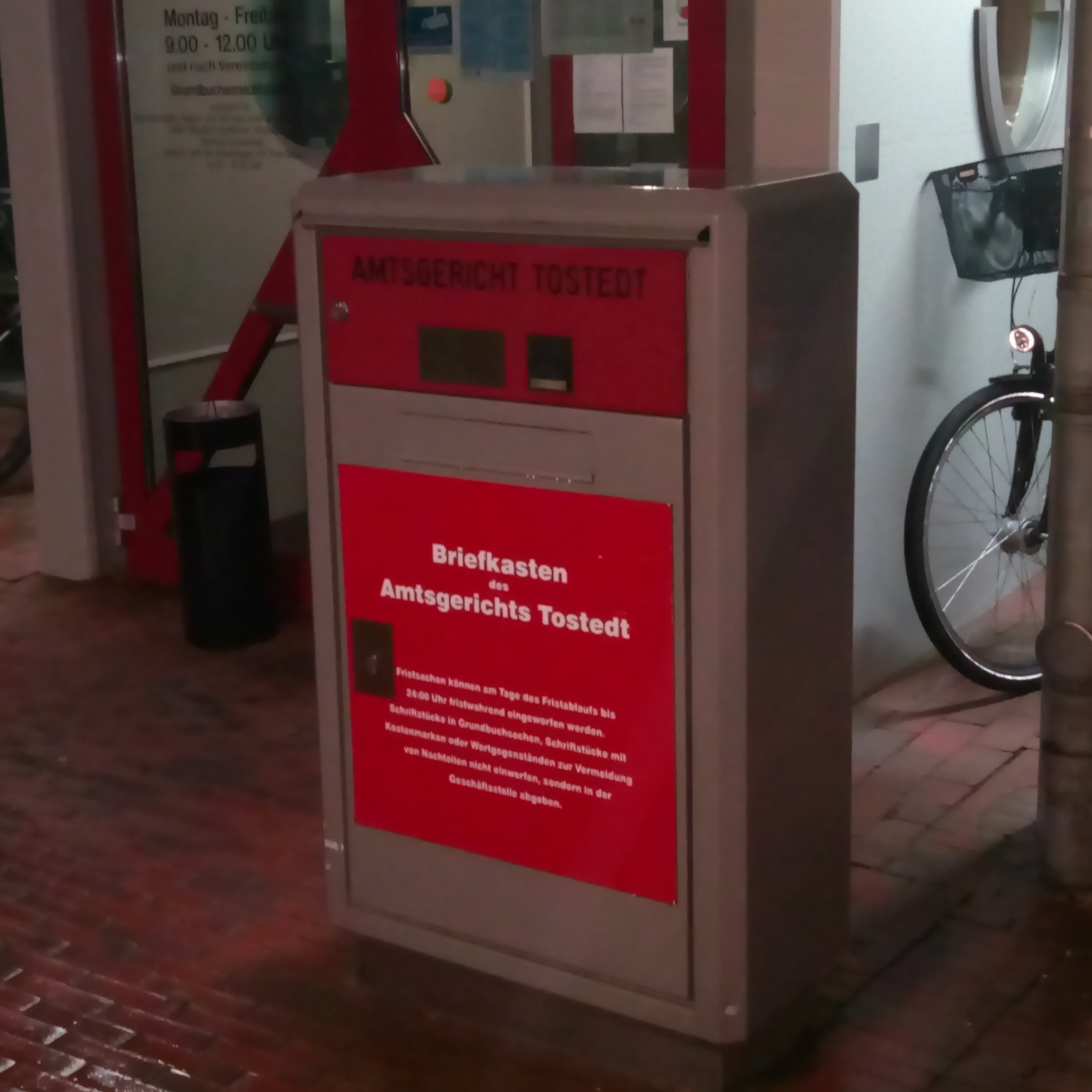 Durch Einwurf Ihrer Postsendung in den Briefkasten kann auch außerhalb der Dienstzeiten der fristgerechte Zugang von Schriftstücken sichergestellt werden. Denn alle Sendungen, die vor 24:00 Uhr in diesen Briefkasten eingeworfen werden, werden als an diesem Tag eingegangen erfasst. Sendungen, die nach 00:00 Uhr eingehen, erhalten den Eingangsstempel des Folgetages.